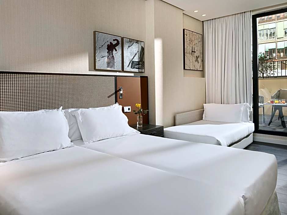 DELUXE TERRACE is 258 square feet and includes either a queen-size bed 150-154 width or 2 single beds 80-130 width plus terrace and satellite tv .
